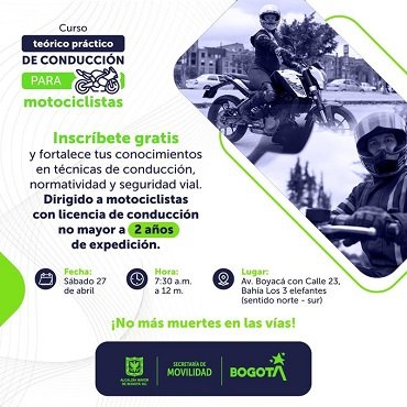 La Secretaría Distrital de Movilidad -SDM- y la Policía de Tránsito de Bogotá, invitan a los y las motociclistas de la ciudad, con licencia de conducción no mayor a dos años, a participar de manera gratuita en el curso teórico práctico de conducción, que se adelantará este sábado 27 de abril de 2024.